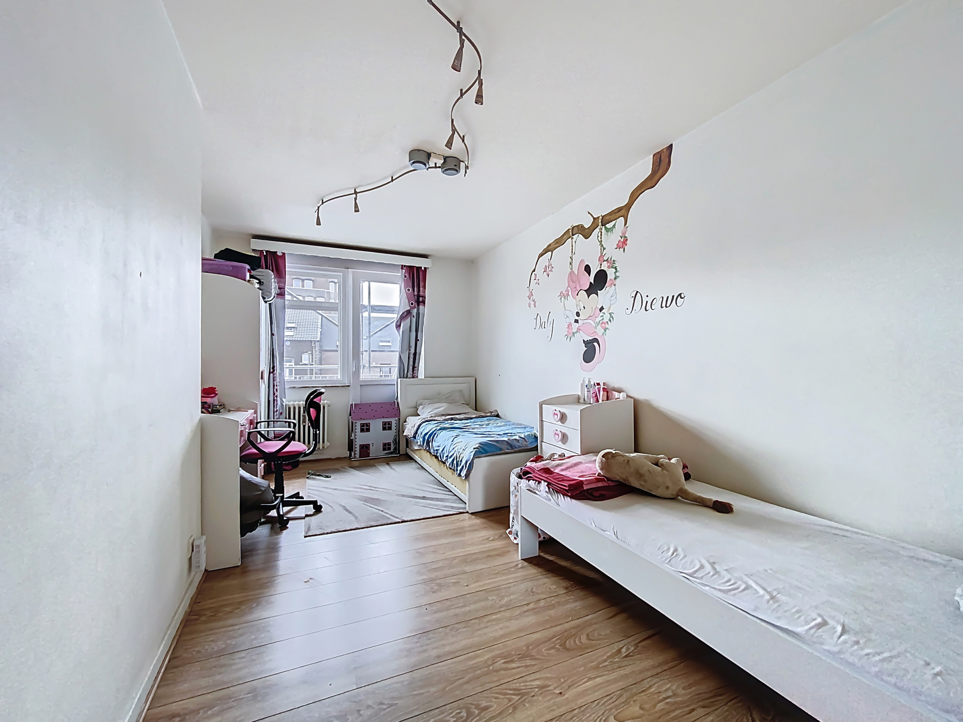 Au 3ème étage de l'immeuble (avec ascenseur), il se compose comme suit : hall d'entrée menant sur un salle à manger avec cuisine ouverte (semi-équipée), un lumineux séjour avec balcon, une salle de douche (+ accès machine à laver), une première chambre de 14m² et la seconde de 16m² avec balcon.
