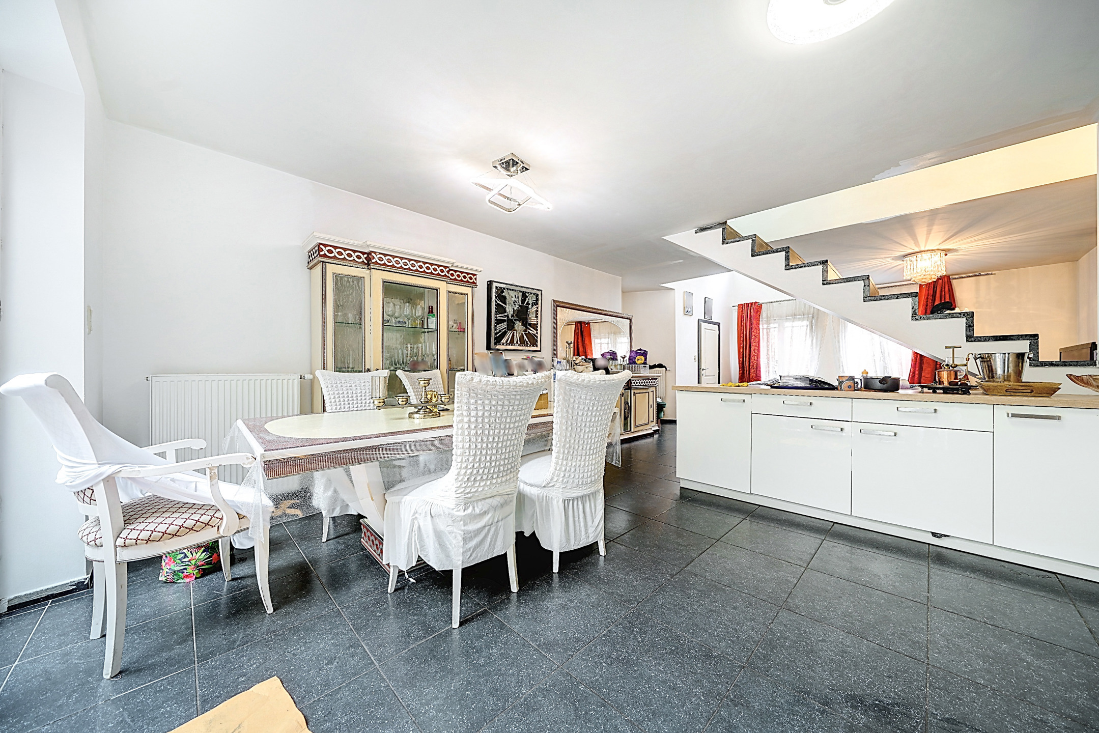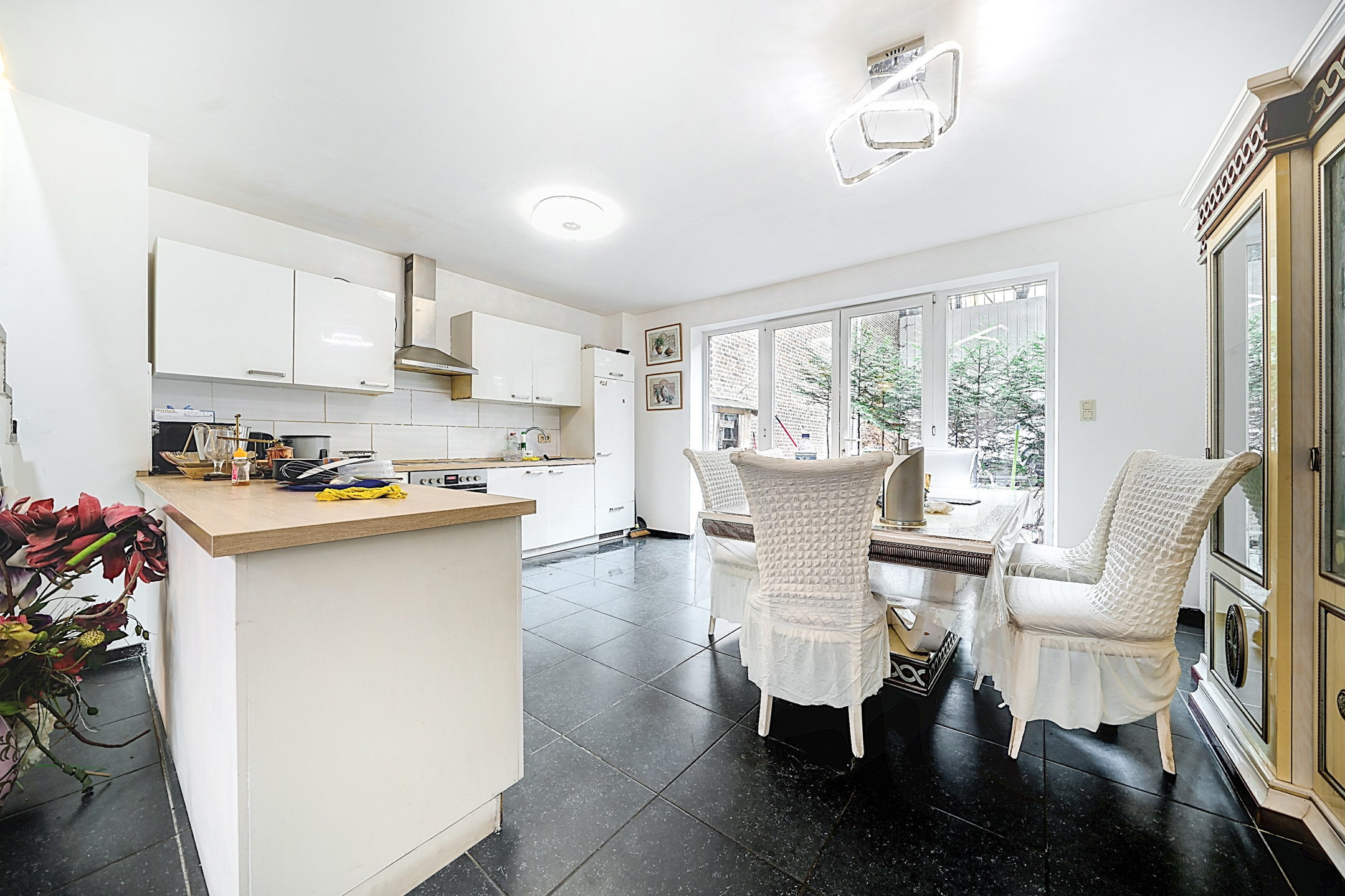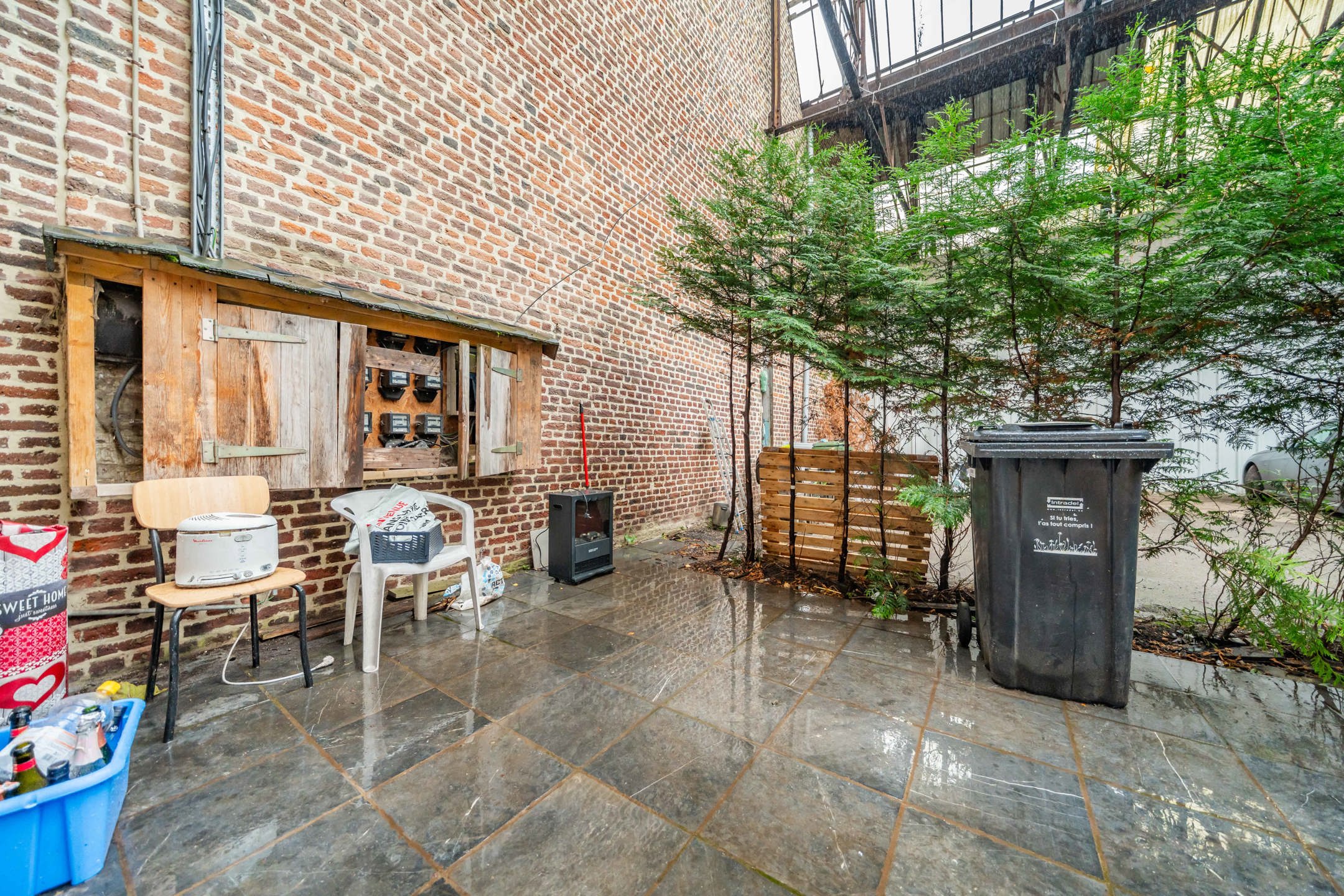 L’appartement dispose de châssis PVC double vitrage, d’un chauffage individuel au gaz (chaudière Vaillant à condensation), de compteurs individuels, d’un parlophone et d’un bardage extérieur en bon état. Hauteur sous plafond du RDC : 2,6 m (salon 5,35 m) – étage : 3 m.