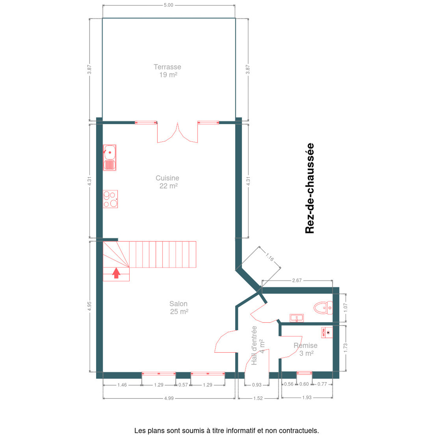 Le rez-de-chaussée (56 m²) comprend un hall d’entrée, un salon de 25 m² avec hauteur sous plafond exceptionnelle (5,35 m), une cuisine équipée de 21,5 m² ouverte sur le séjour (four, taques vitrocéramiques, hotte, frigo encastré), un WC séparé et une remise. Accès direct à la terrasse arrière, parfaite pour profiter de l’extérieur.