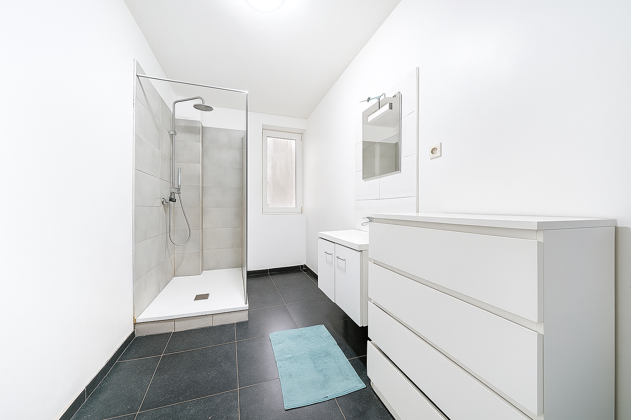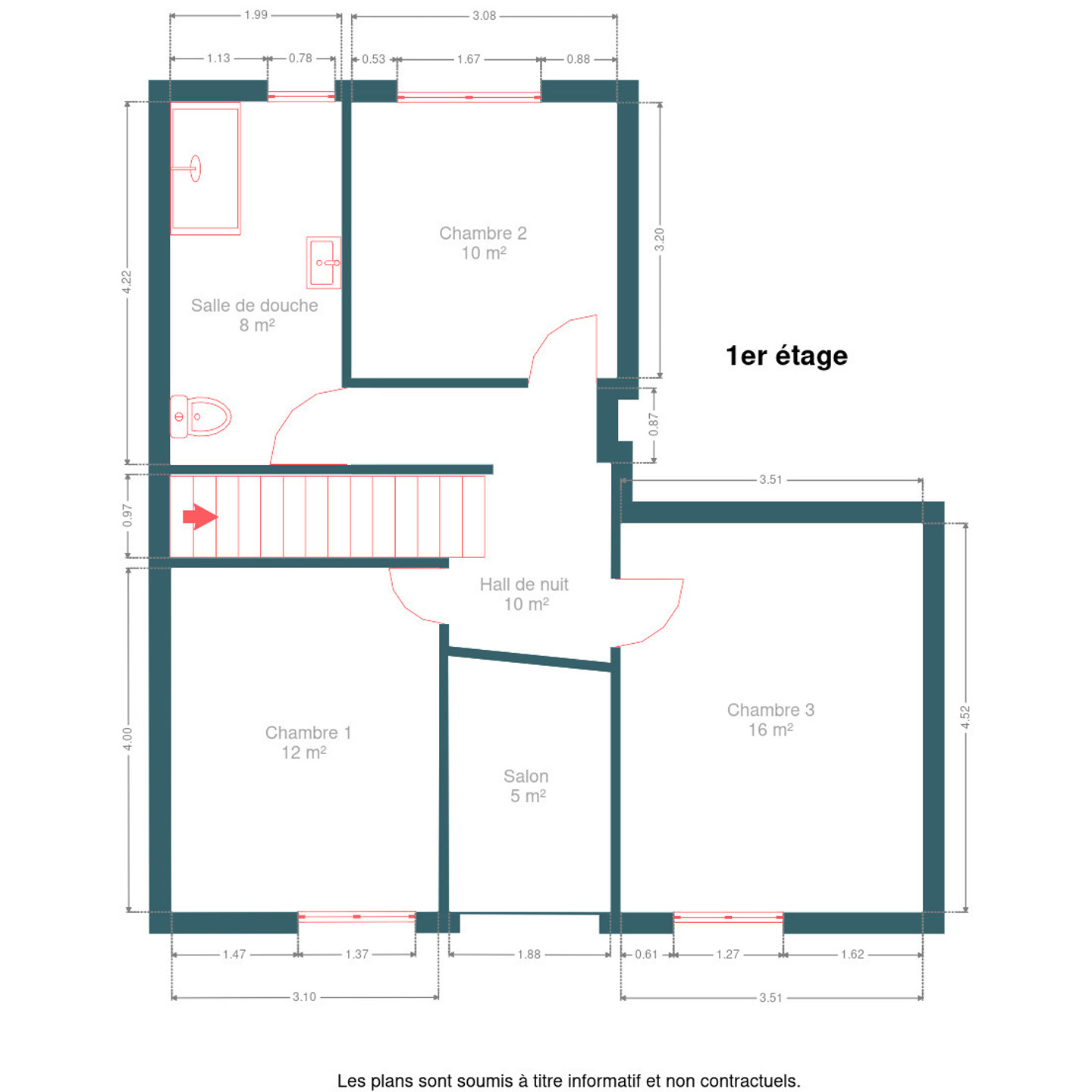 Au 1er étage (56 m²), vous trouverez un hall de nuit, 3 chambres confortables (12,4 – 9,9 – 15,9 m²) et une salle de douche de 8,4 m² avec douche italienne, WC et lavabo.