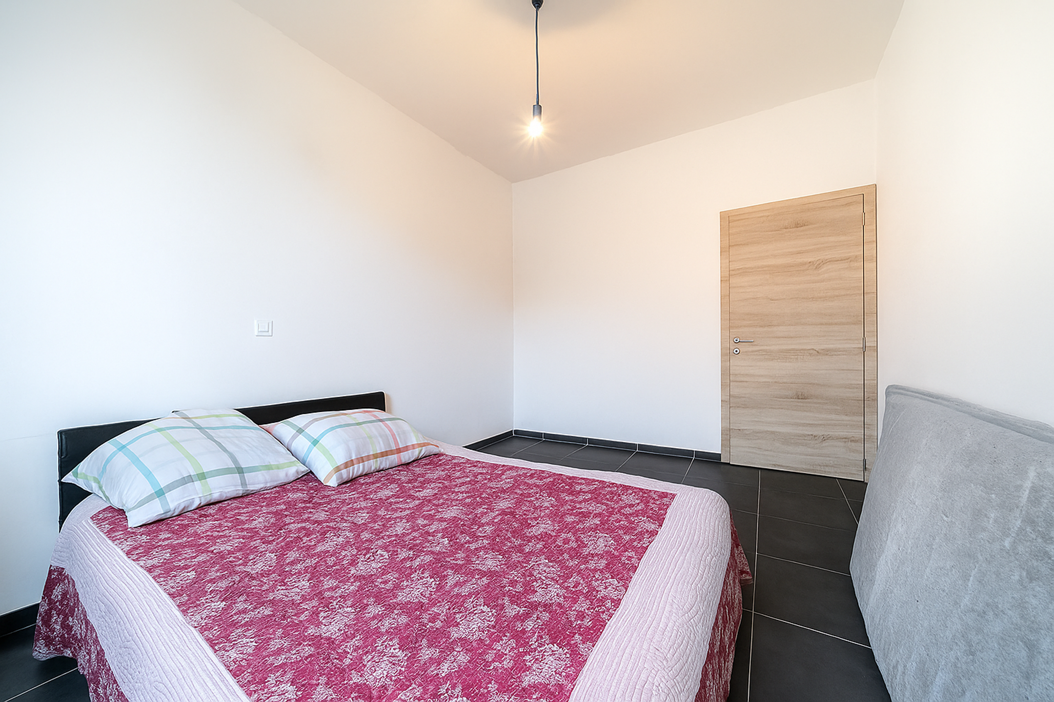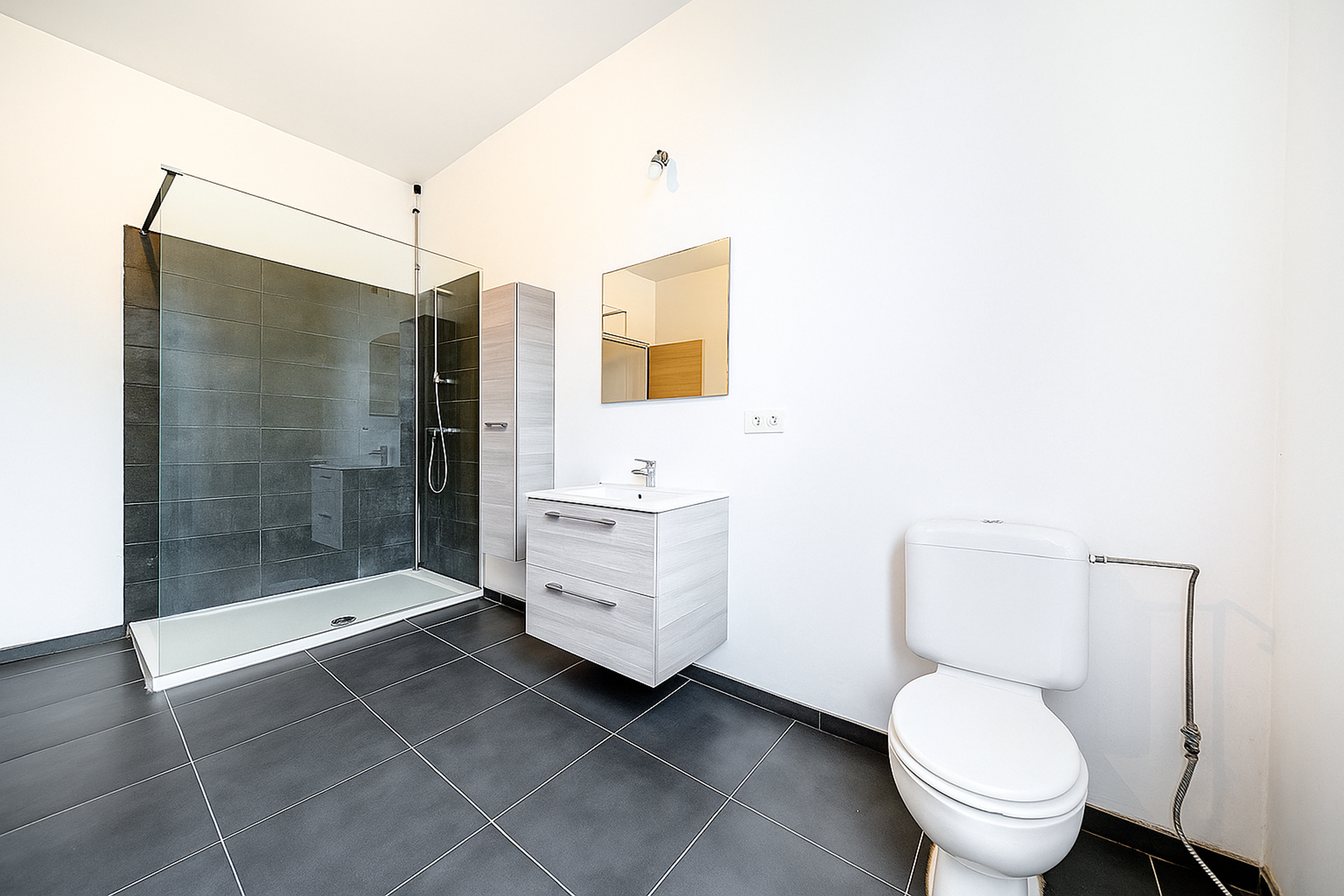 L’appartement se compose d’un hall d’entrée, d’un vaste living de 33,5 m² avec cuisine ouverte équipée (four, taques vitrocéramiques, hotte), d’une buanderie, d’une salle de douche avec WC et de deux chambres de 14,7 m² et 13,6 m². Hauteur sous plafond 2,80 m, châssis PVC double vitrage et sol facile d’entretien.