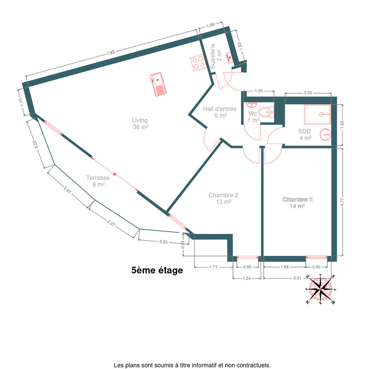 Il se compose d’un grand séjour baigné de lumière naturelle donnant accès à la terrasse avant, d’une cuisine américaine contemporaine et fonctionnelle, de deux chambres spacieuses, d’une salle d'eau moderne, d’une toilette séparée ainsi que de l'espace de rangement dans la buanderie.
