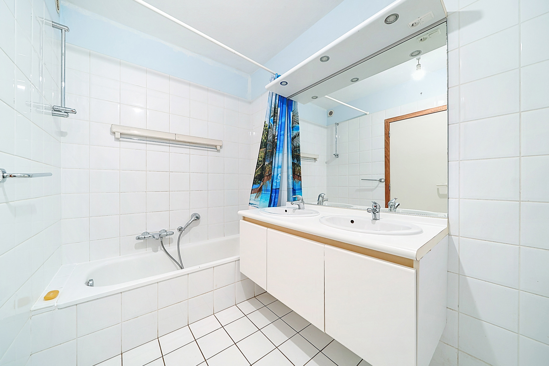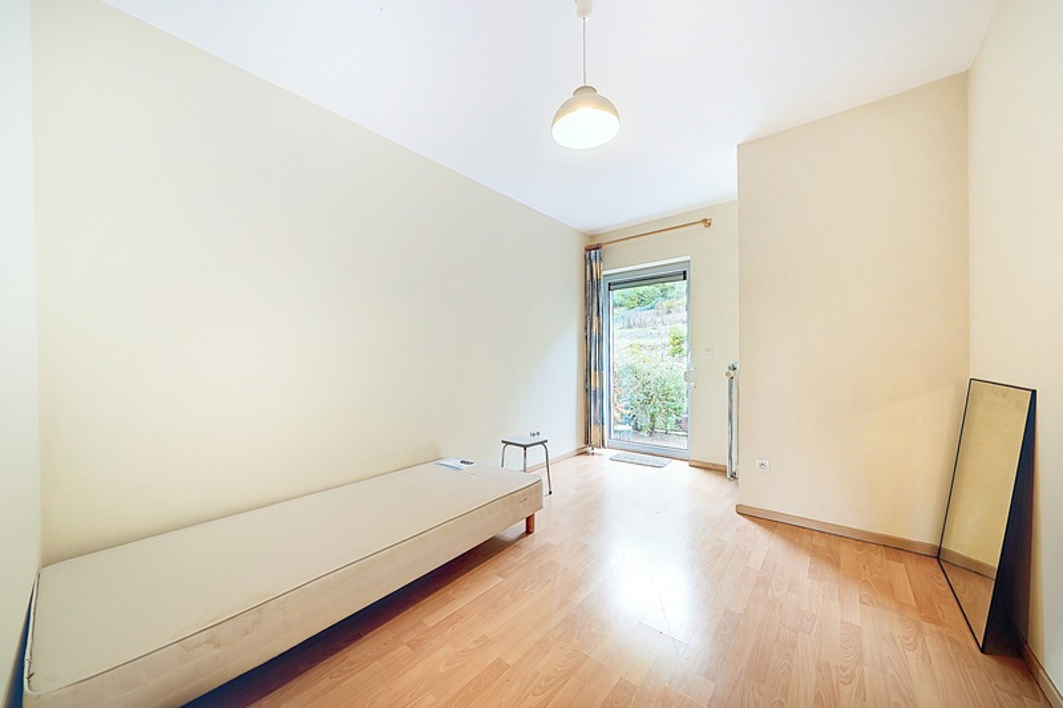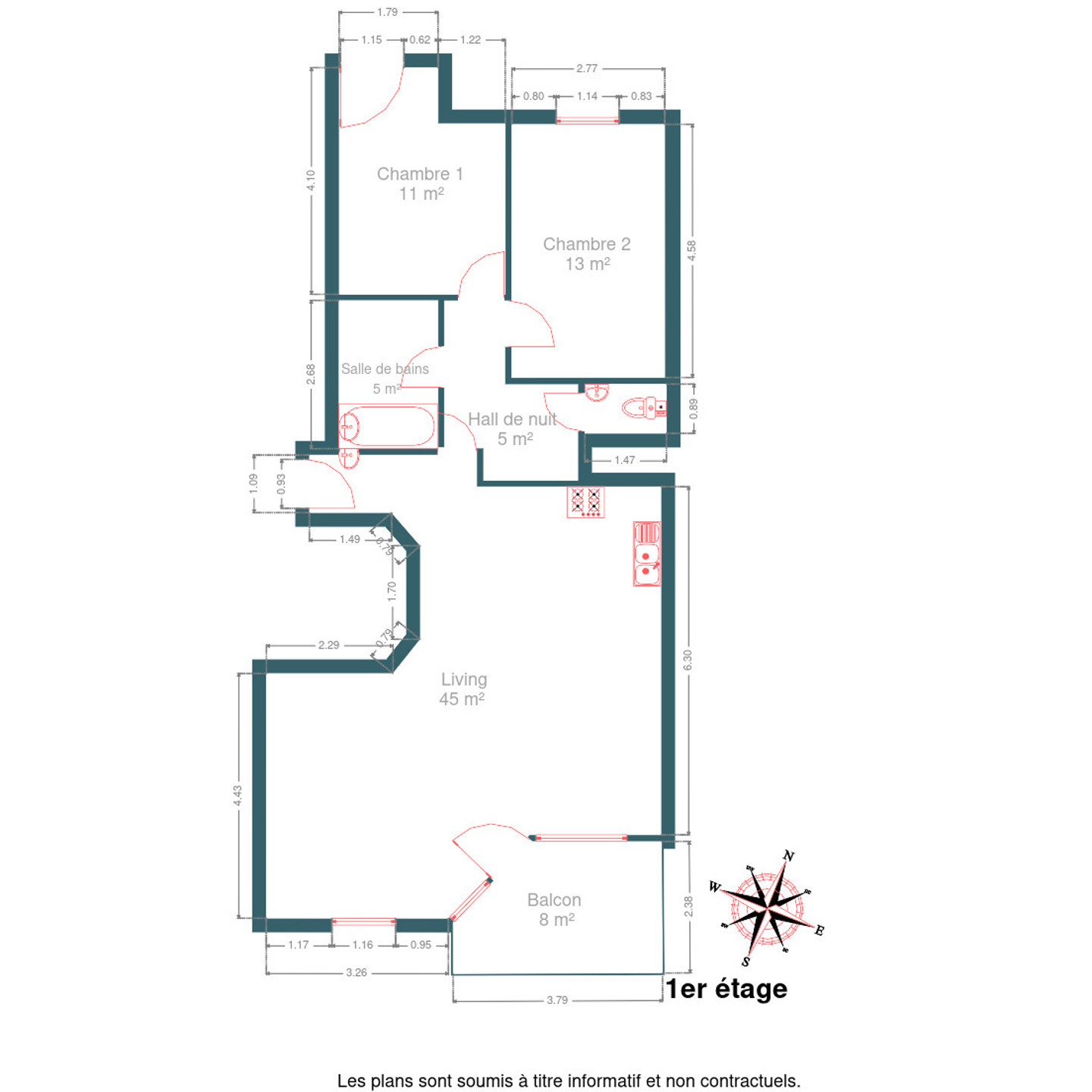 Au premier étage avec ascenseur, vous serez accueilli par un spacieux séjour de 45 m², avec une cuisine ouverte, qui donne sur une terrasse couverte de 8 m². Un hall avec WC sépare les espaces nuit, où vous trouverez deux belles chambres (11 m² et 13 m²) ainsi qu'une grande salle de bain.