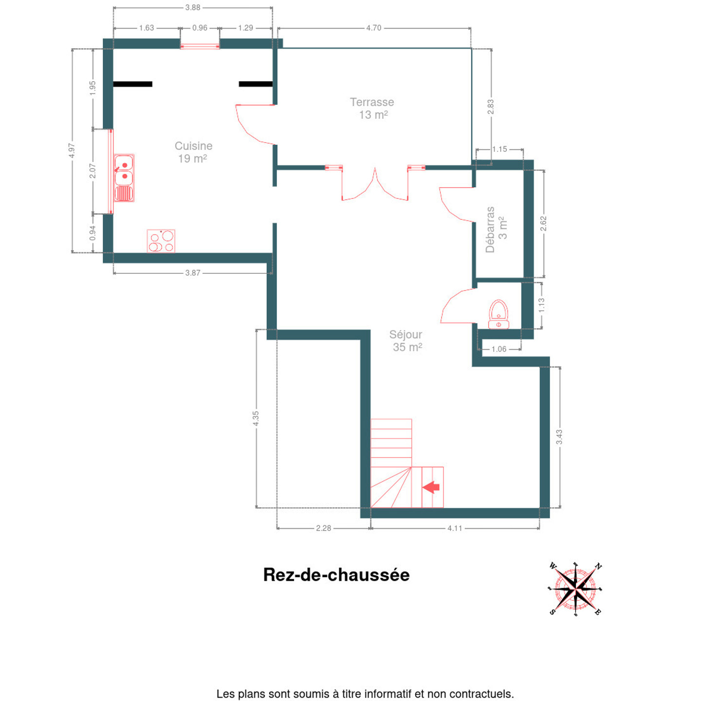 Dès l’entrée, vous découvrirez de beaux volumes ouverts comprenant une cuisine équipée et un séjour de 35 m², offrant un espace de vie agréable et harmonieux. Un WC indépendant complète ce niveau.