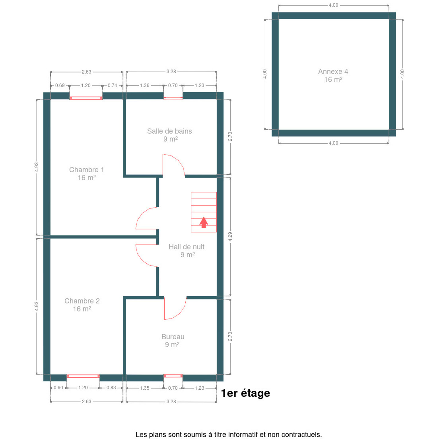 À l’étage, vous trouverez trois belles chambres (16 m², 16 m² et 9 m²) ainsi qu'une salle de bain de 9 m².