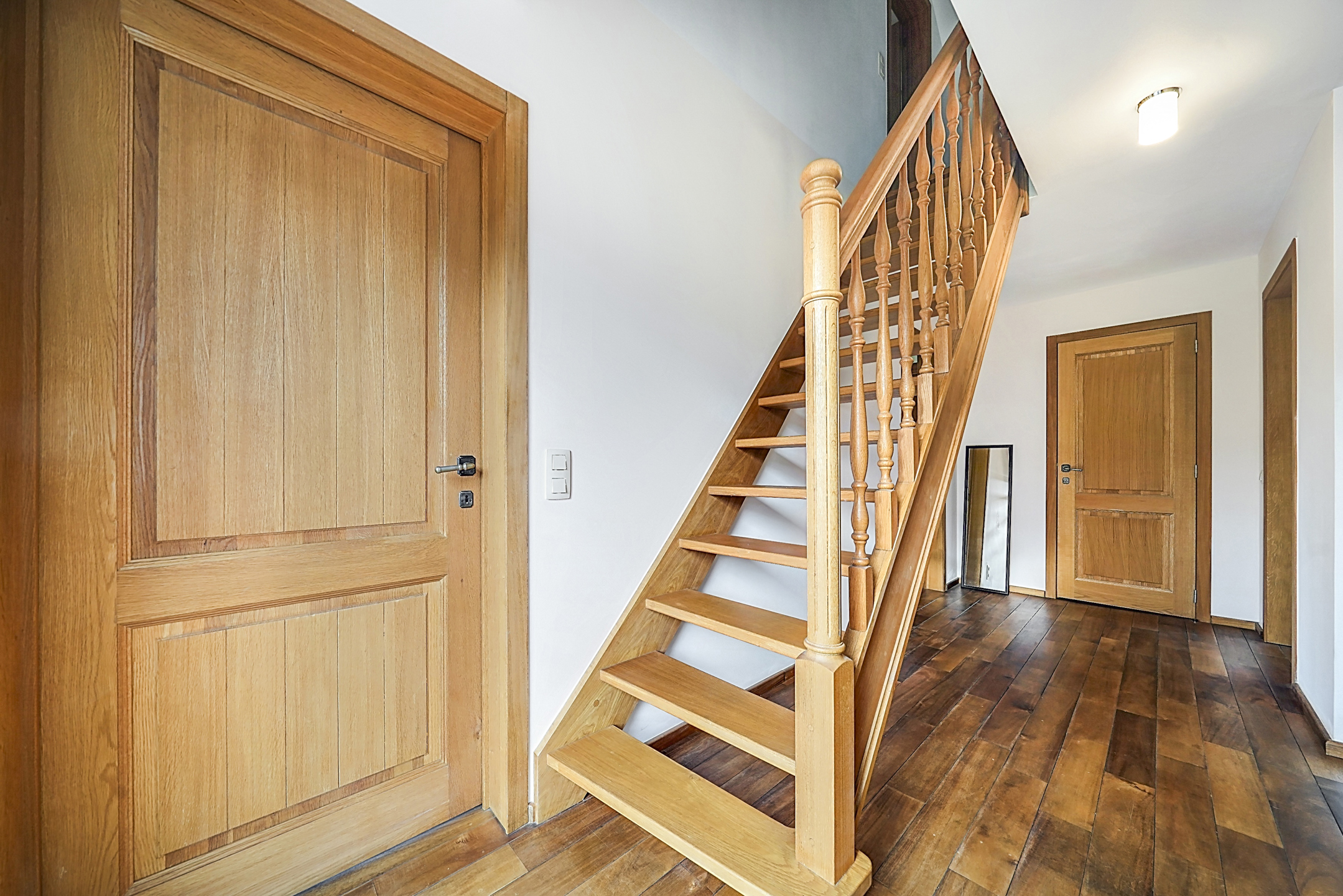 Érigée en ossature bois et conçue uniquement avec des matériaux haut de gamme et écologiques, elle respire la qualité : parquet en noyer massif, cuisine sur mesure en chêne et son superbe plan en pierre Jasberg, portes et escaliers en chêne, châssis Afzelia anti-effraction… chaque détail reflète un choix réfléchi, durable et élégant.