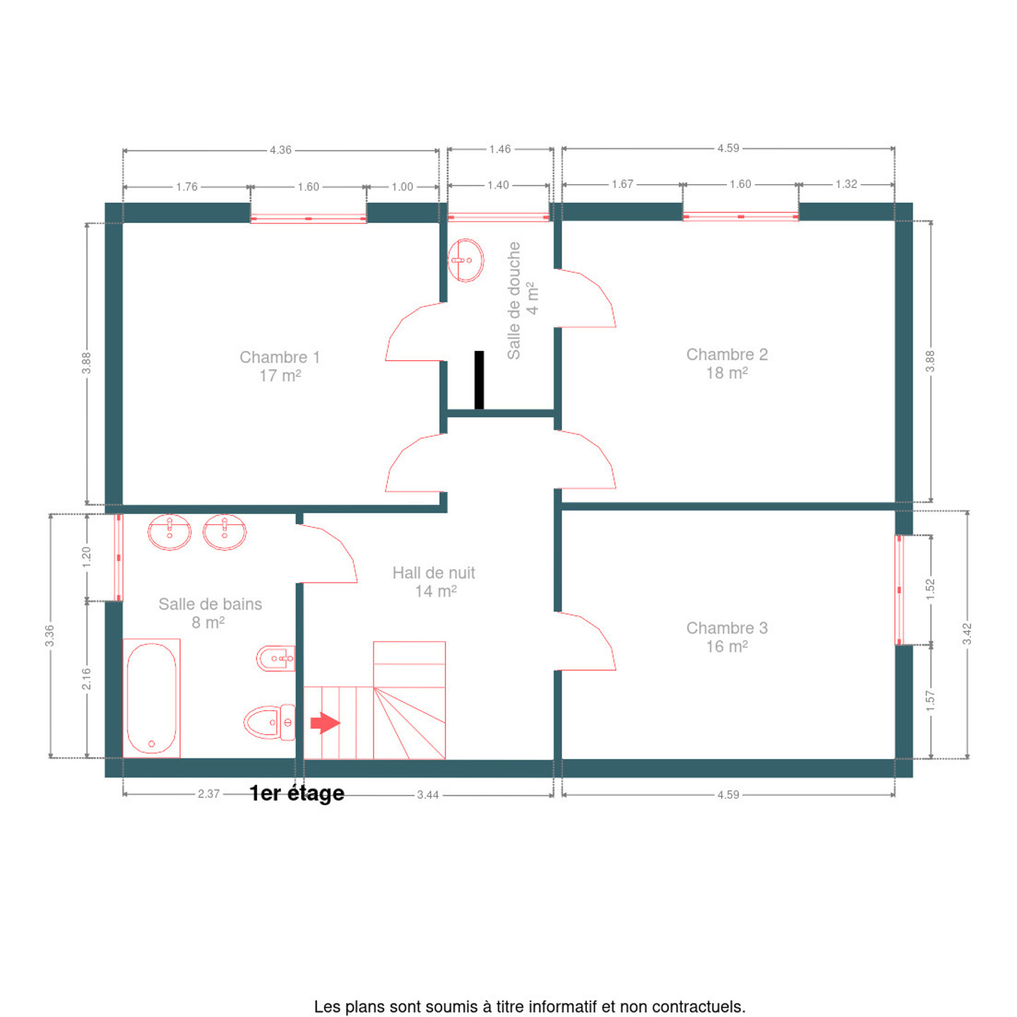 À l’étage, la maison dispose de 4 chambres, 2 salles d’eau et 1 salle de bai, garantissant confort et intimité pour chacun.