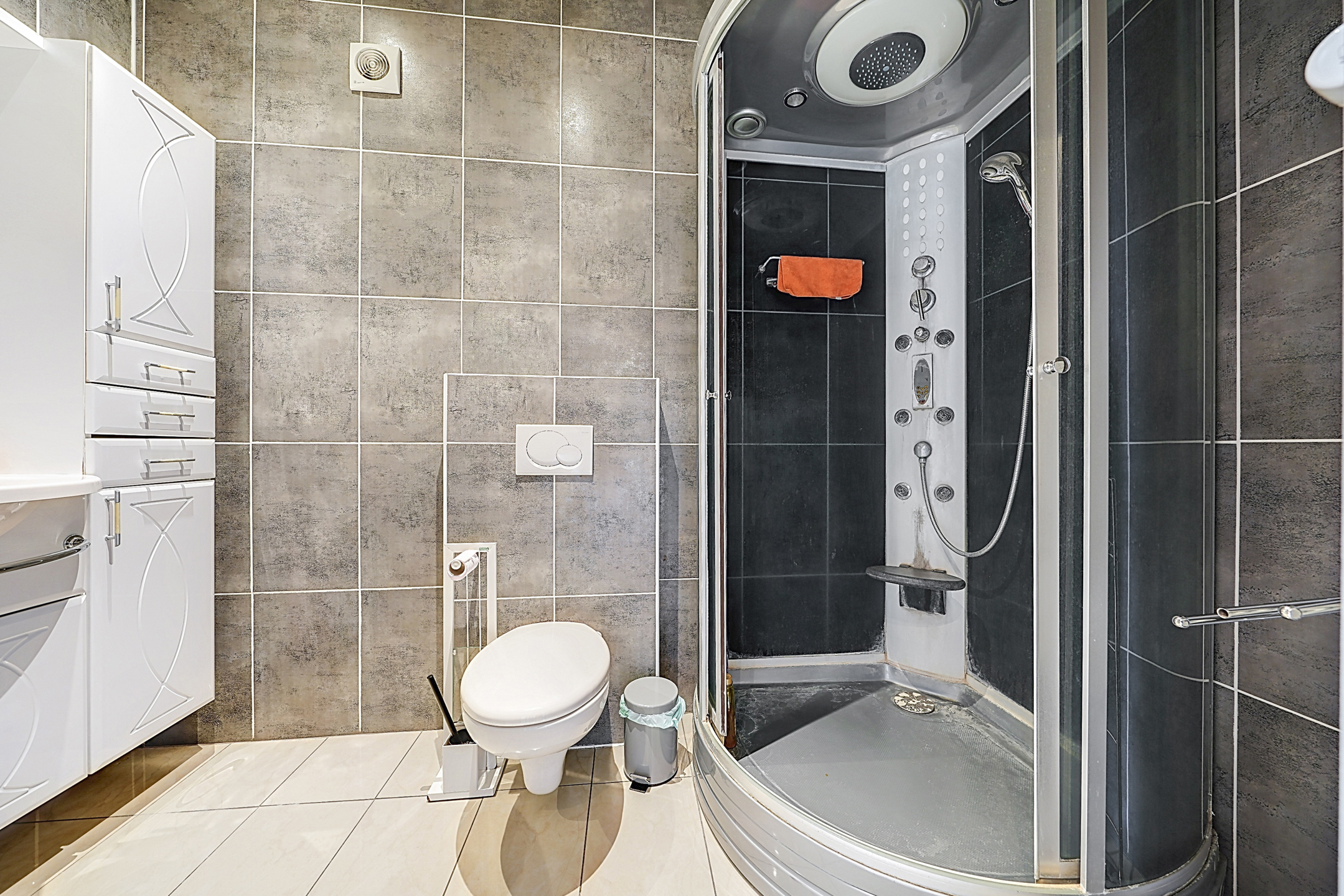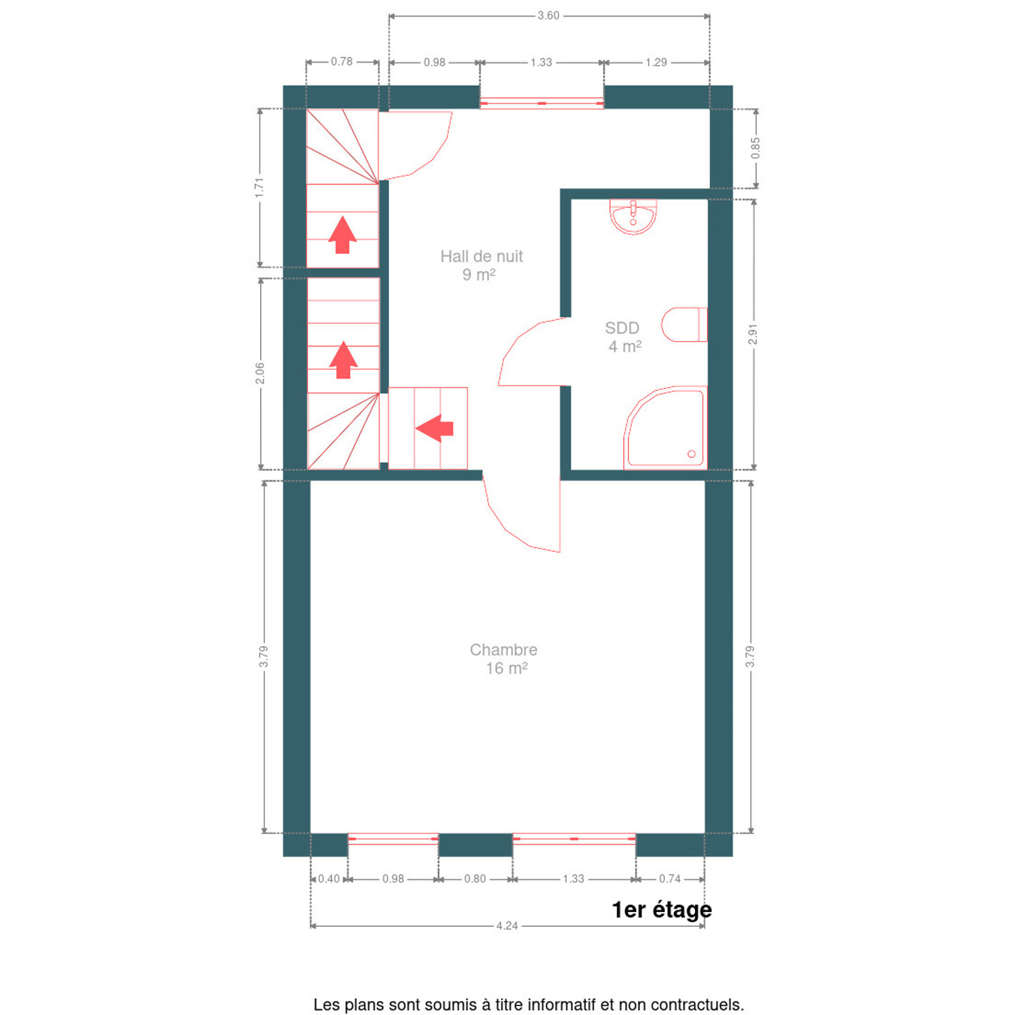 Au 1er étage (±32 m²), vous découvrirez une chambre spacieuse, une salle de douche avec WC et un hall de nuit.