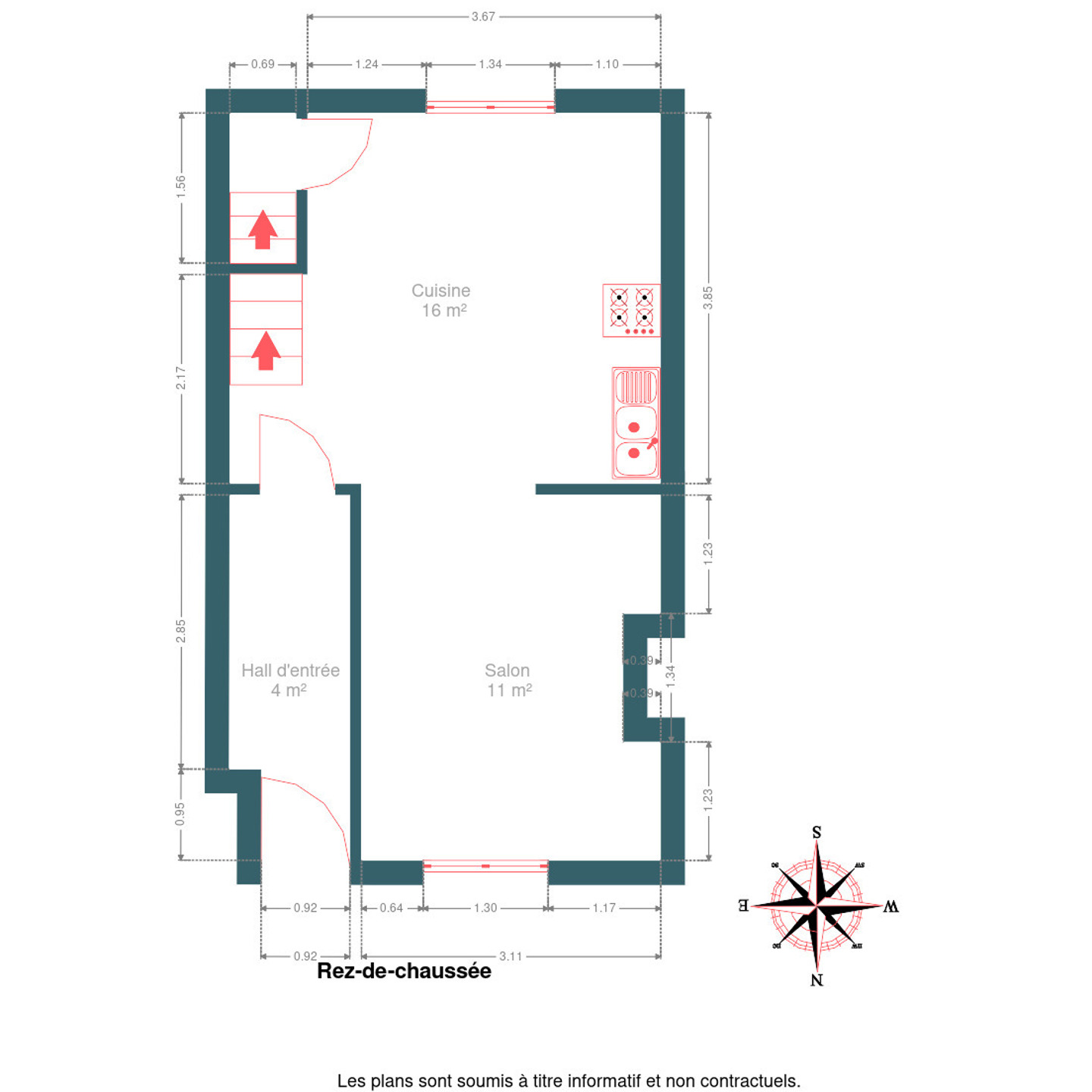 Le rez-de-chaussée (±34 m²) offre un hall d’entrée, un salon lumineux ouvert sur la cuisine équipée, un accès direct au jardin orienté sud et l’escalier vers les étages.