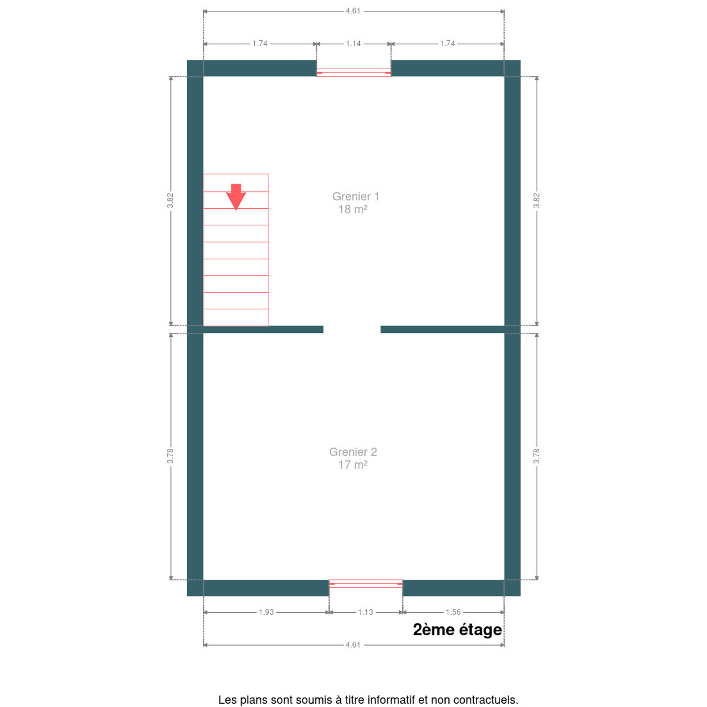 Le 2e étage (±35 m²) comprend deux greniers aménageables, parfaits pour créer deux chambres supplémentaires ou un espace de télétravail.