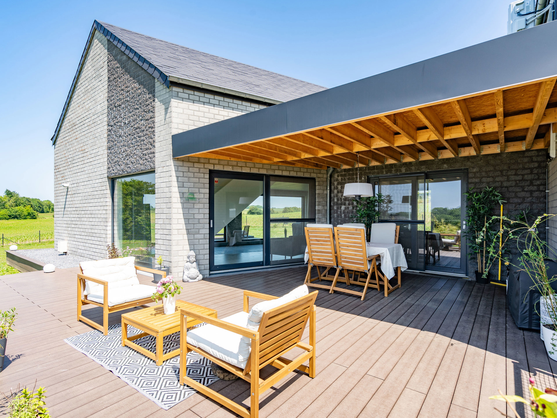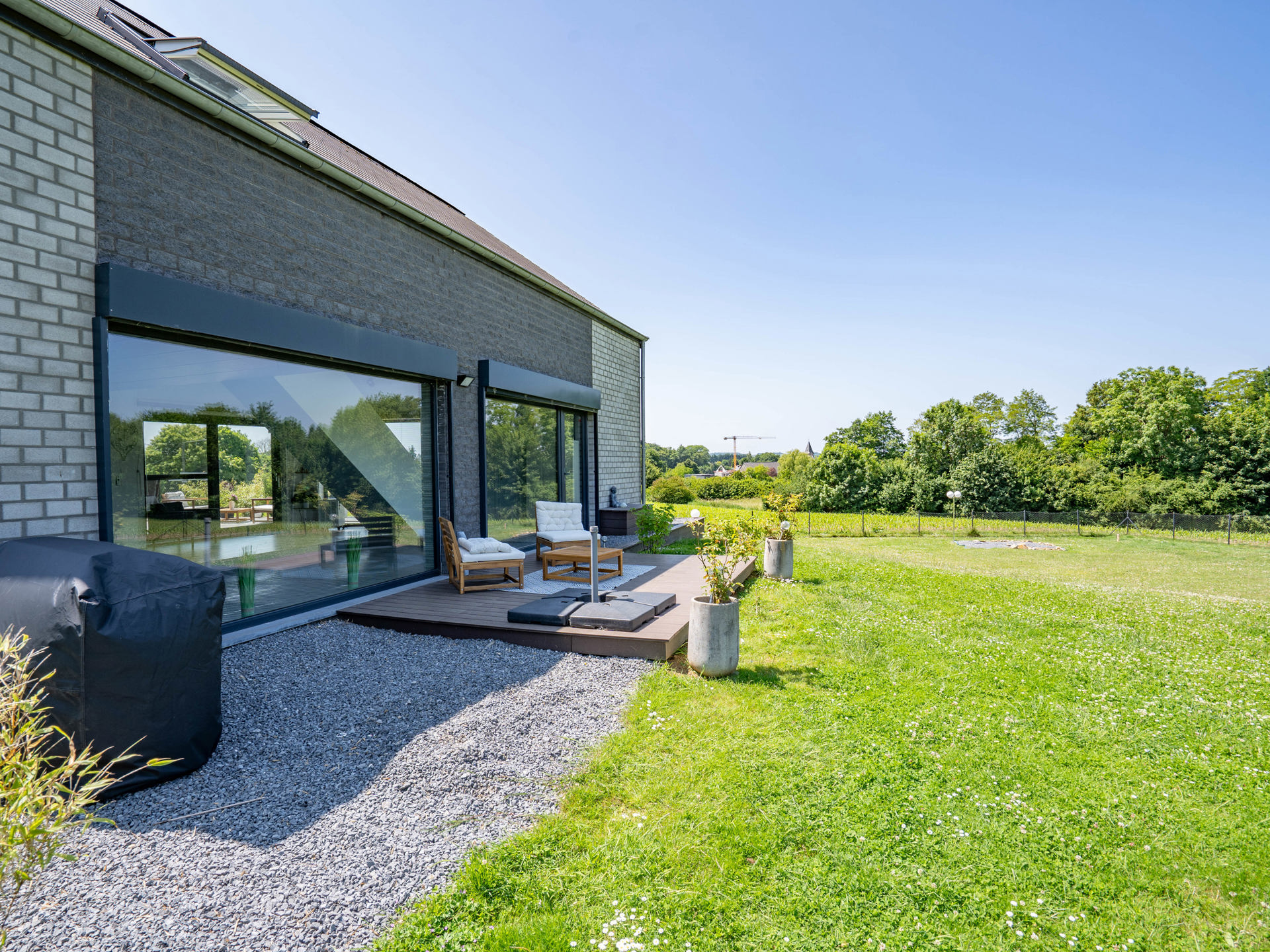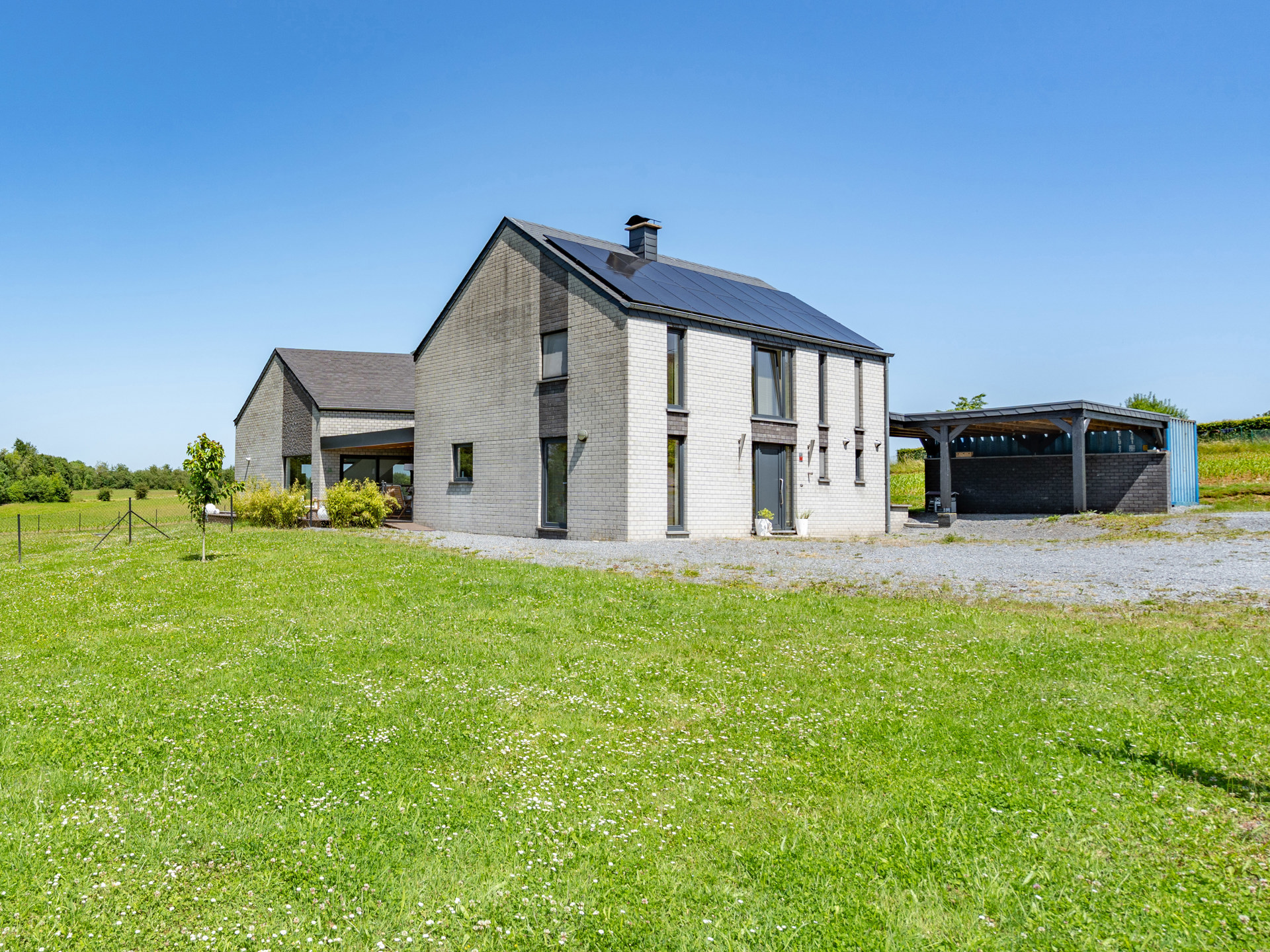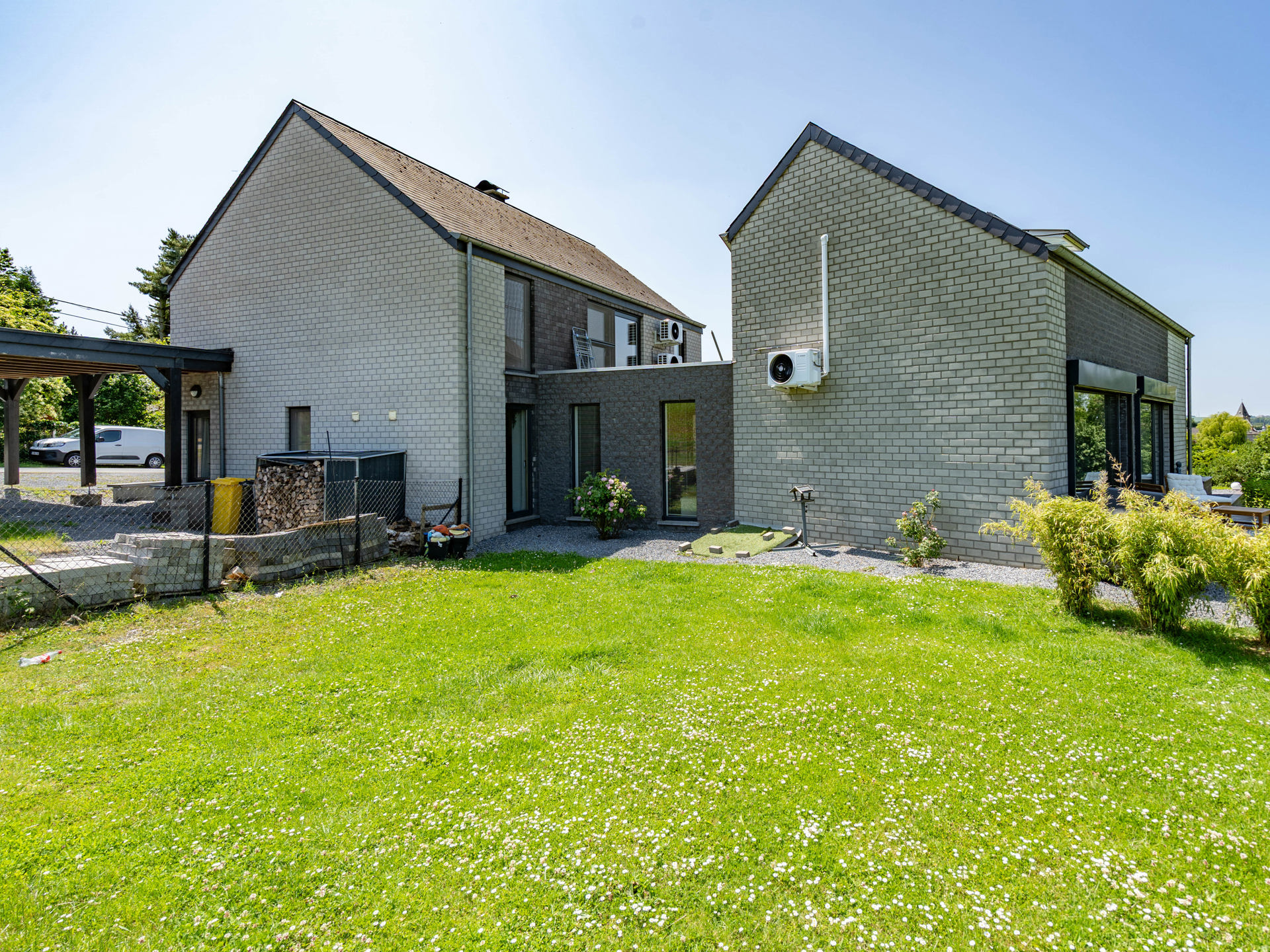 À l’extérieur, vous découvrirez un vaste jardin verdoyant, une terrasse idéalement orientée pour vos repas en plein air, ainsi qu’un carport pratique.