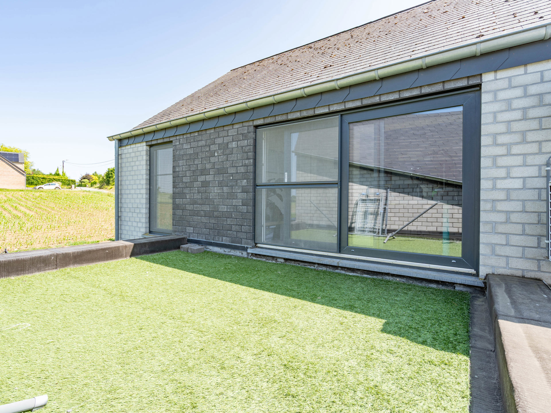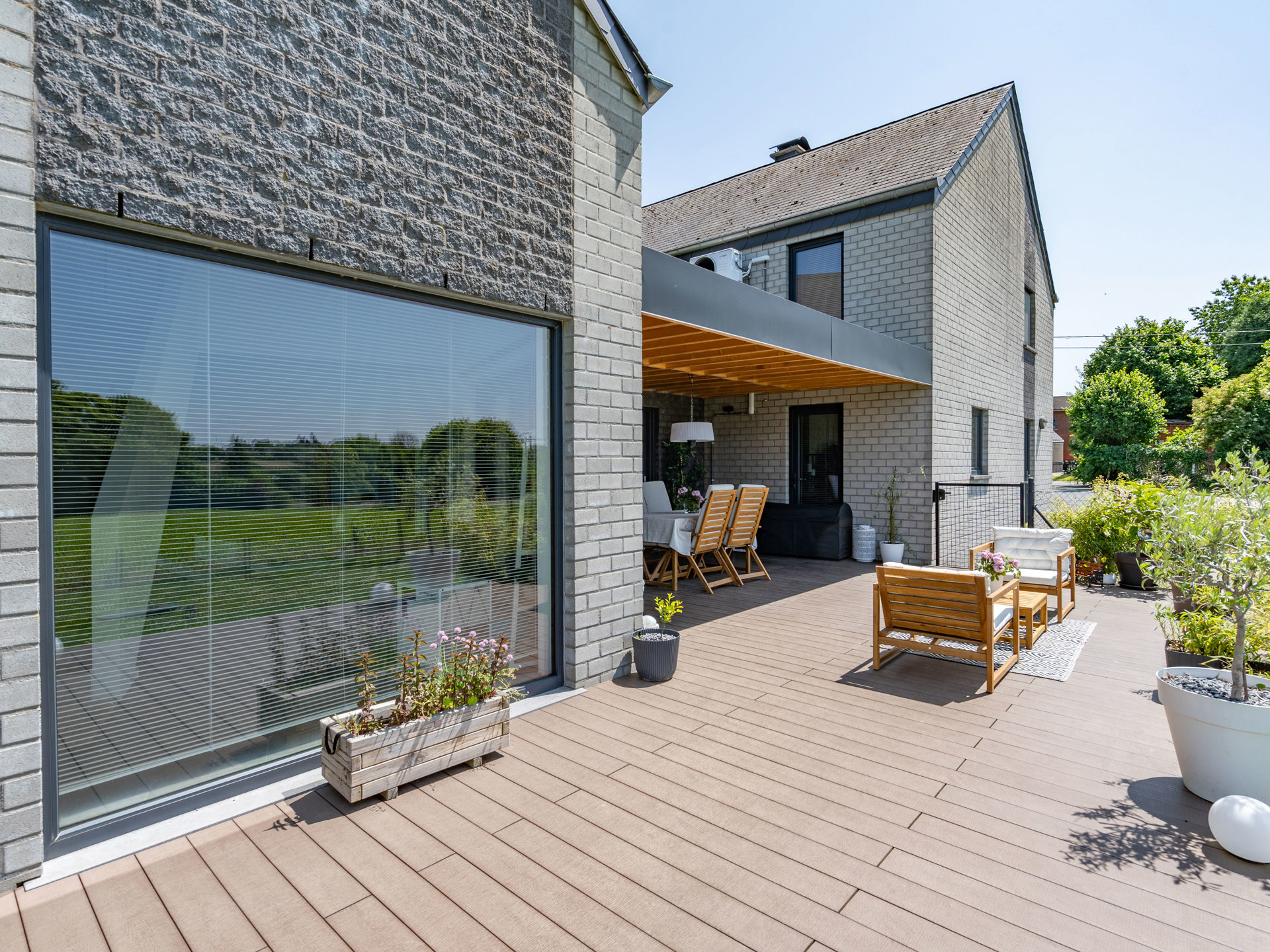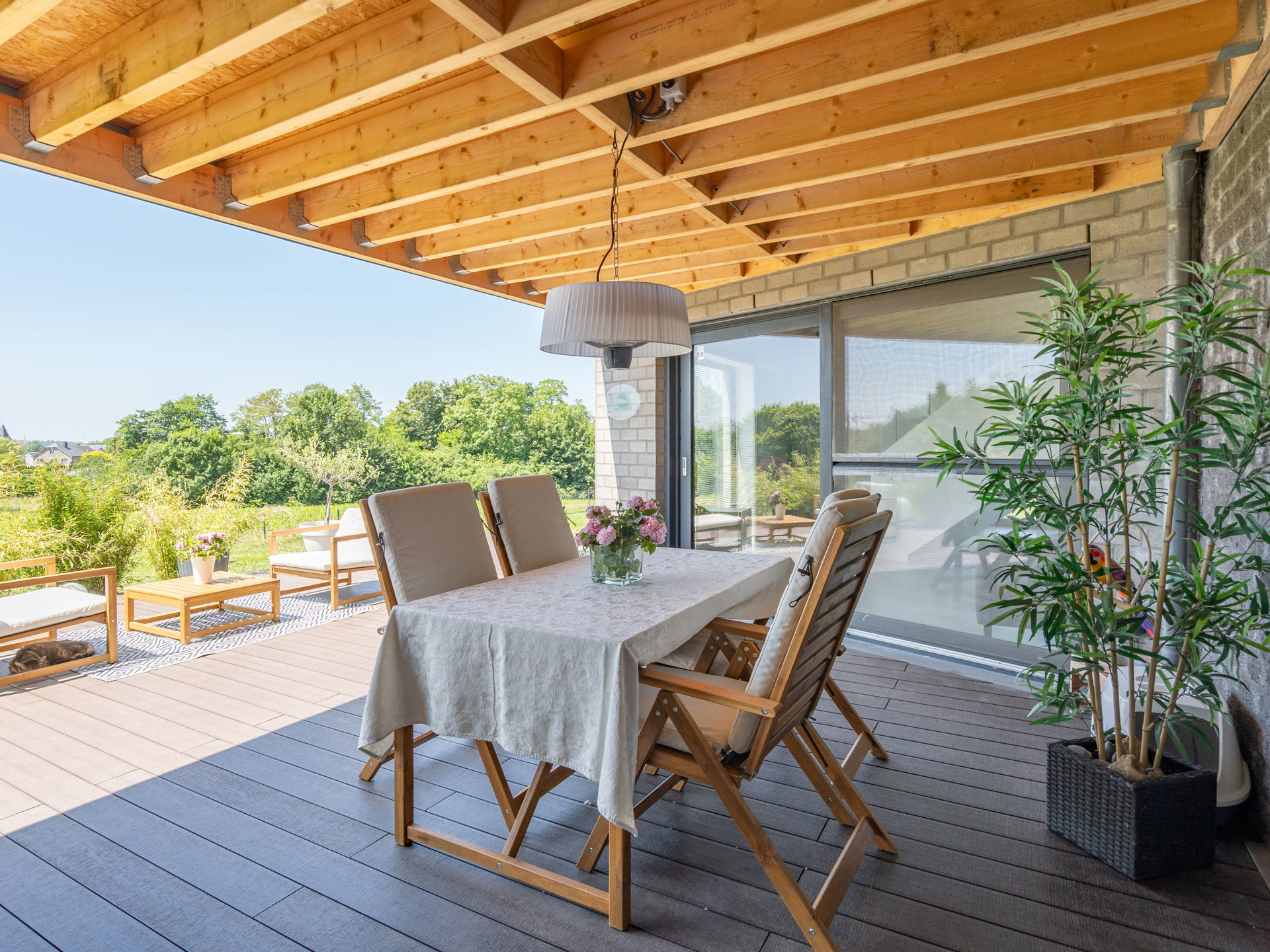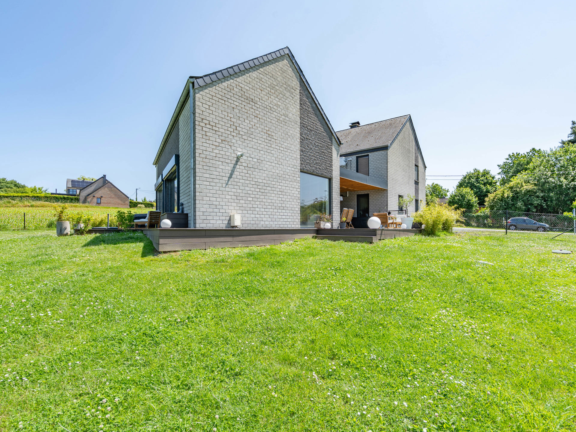 À l’extérieur, vous découvrirez un vaste jardin verdoyant, une terrasse idéalement orientée pour vos repas en plein air, ainsi qu’un carport pratique.