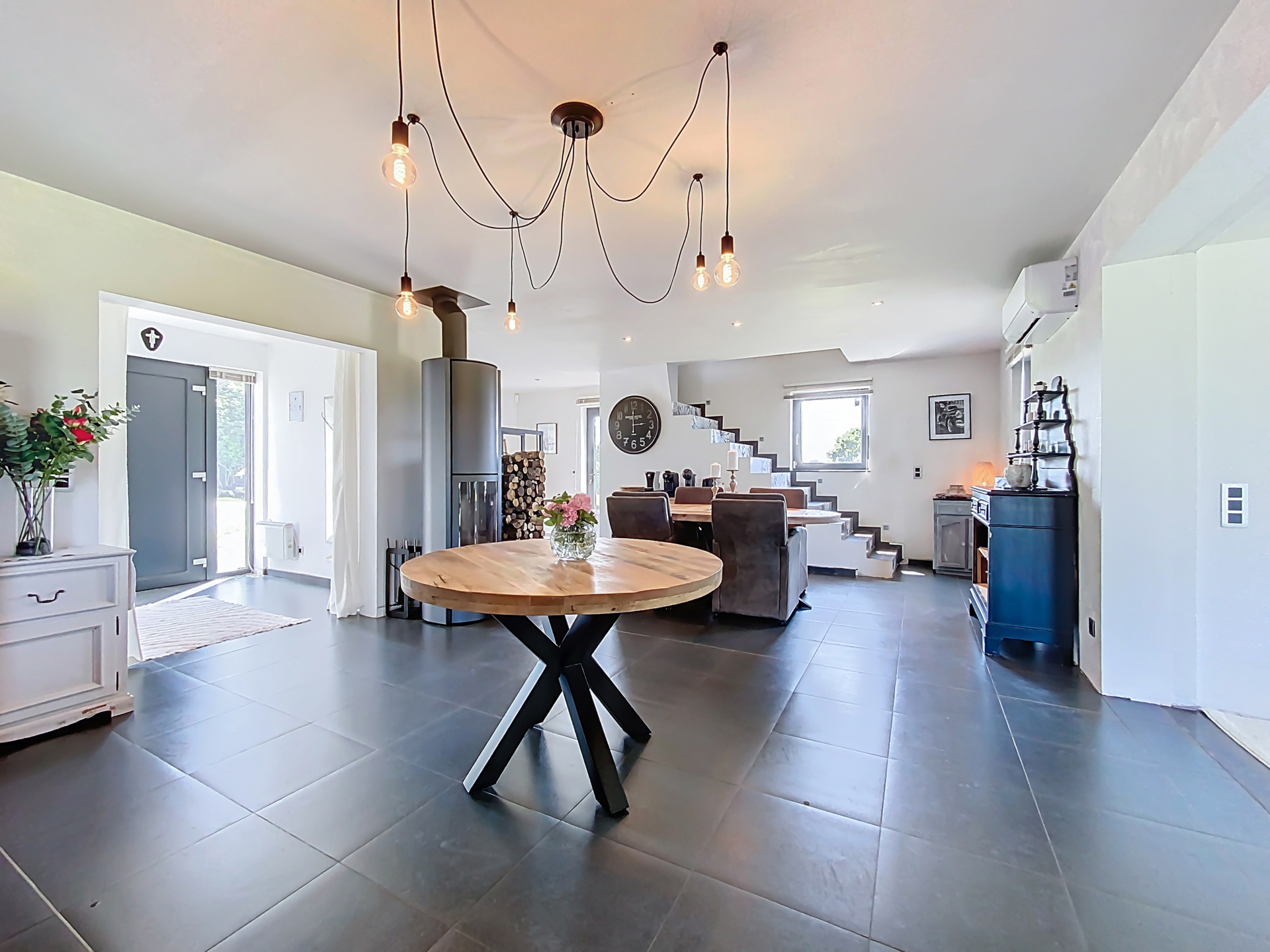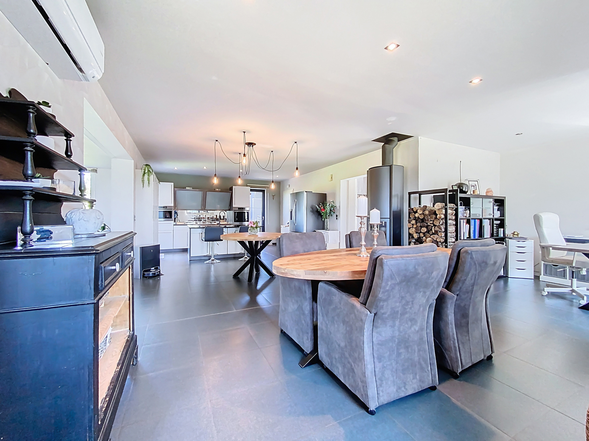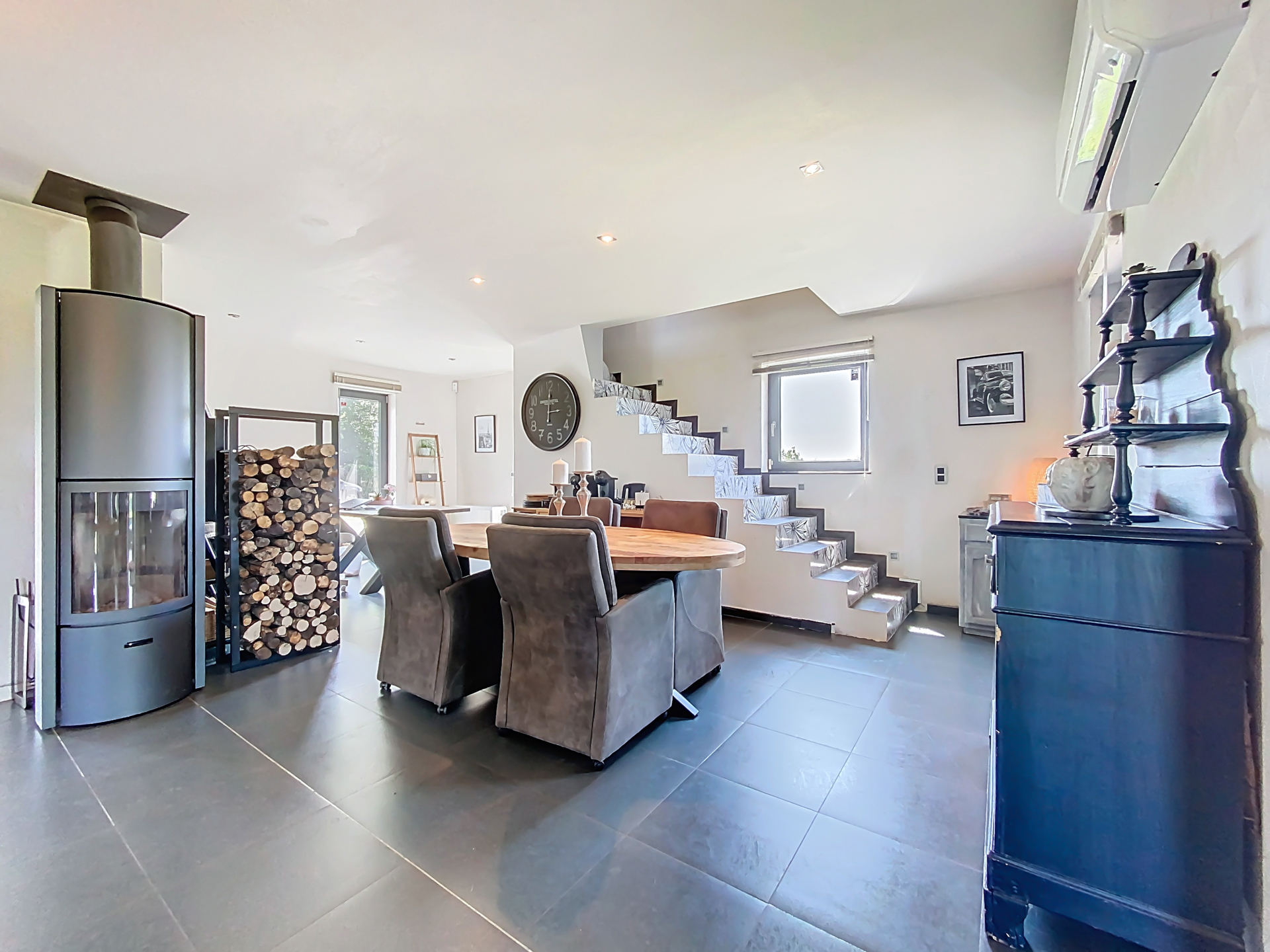 Cette maison est équipée d'un poêle à bois pour une touche chaleureuse, des climatisations, châssis double vitrage PVC, électricité conforme, et PEB C (réalisé avant les rénovations).