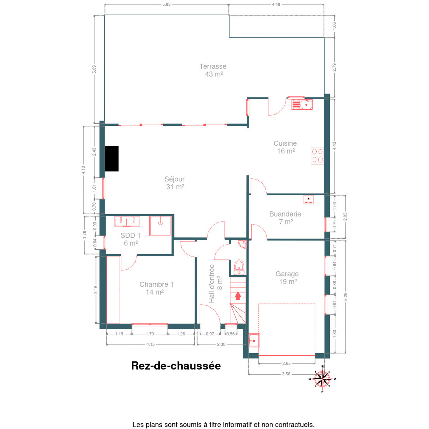 En entrant, vous découvrirez un vaste hall d'entrée qui dessert d'une part les espaces de vie : un séjour lumineux comprenant un salon, une salle à manger et une magnifique cuisine ouverte, entièrement équipée. D'autre part, vous trouverez la première chambre, dotée d'une salle de bain privative. Cette maison offre un confort de plain-pied. Pour compléter le rez, une buanderie et un garage sont également à votre disposition.
